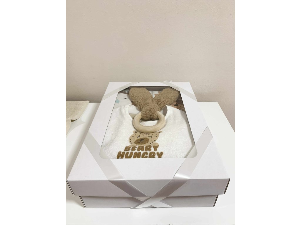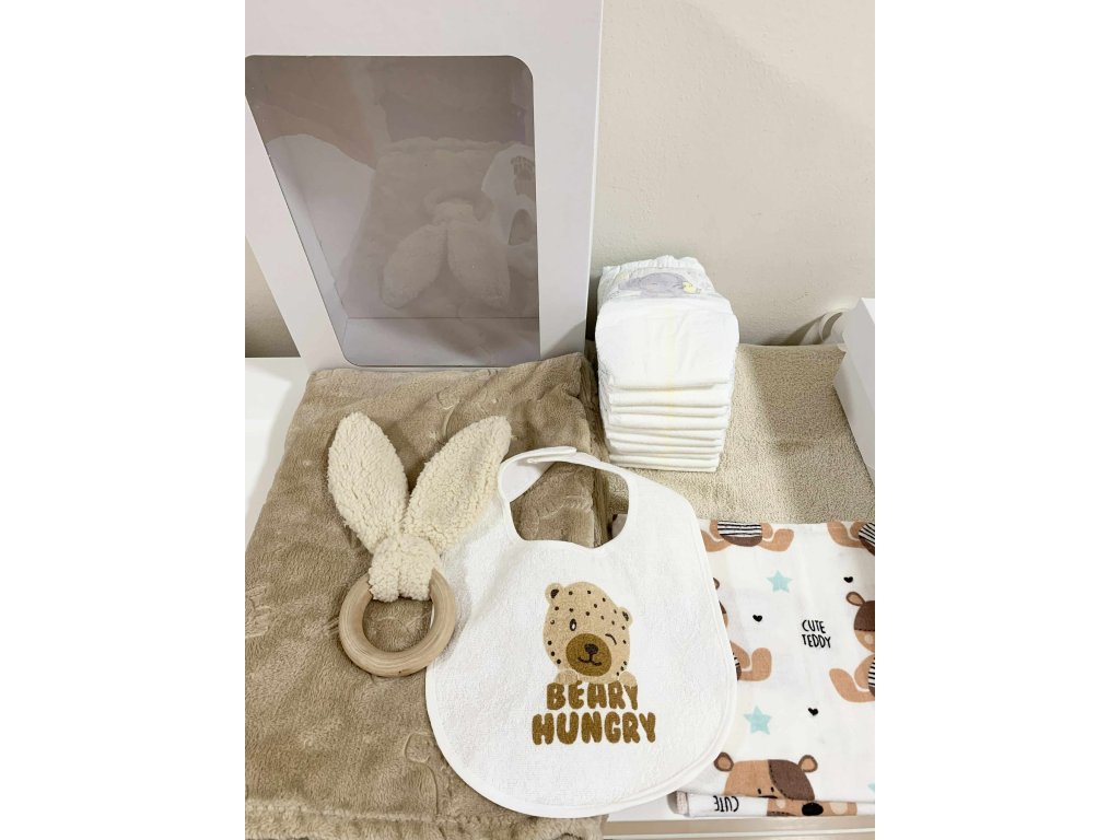 Obsahuje: barevnou pevnou krabičku , dětskou deku 100x80cm , 1x dětskou flanelovou plenku s potiskem, jednorázové plenky10ks přebalovací podložku, bryndáček.