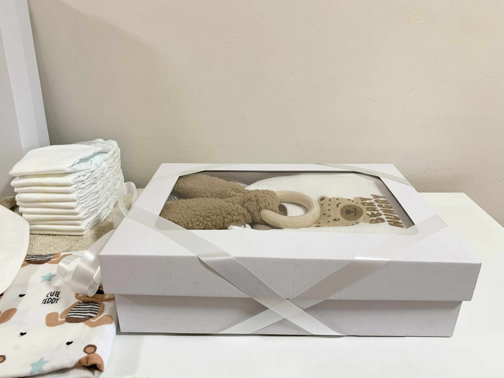 Dárková krabička s praktickými věcmi pro miminko. Krabičku lze později použít na maličkosti pro miminko.